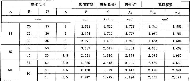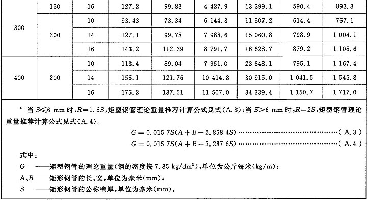 表A.2 矩形鋼管的尺寸、理論重量和物理參數