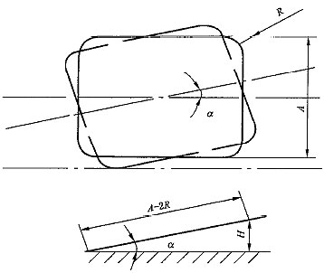 取兩塊邊長大于被測鋼管邊長的鋼板,在標準平板上,使其平行間距為1m并固定,作為測量鋼管扭轉值的簡單量具。測量時,將量具覆于被測鋼管表面(量具方向與鋼管方向一致),使量具一端緊貼鋼管平面,若有扭轉,量具另一端必與鋼管平面構成一夾角,用塞尺測量此夾角的最大距離H(計算公式見式(B.1)),此值即為該鋼管的扭轉值(測定示意圖見圖B.1)。