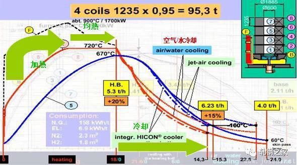 a) 氫氣的密度僅是氮?dú)獾?/14,氫氣的導(dǎo)熱系數(shù)是氮?dú)獾?倍。氫氣重量輕,滲透能力強(qiáng),可以滲入鋼卷層間,充分發(fā)揮導(dǎo)熱系數(shù)大的特點(diǎn),顯著提高傳熱效率;并可提高內(nèi)罩內(nèi)保護(hù)氣體的循環(huán)量。