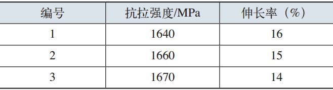 對加工完成的螺釘及同爐拉伸試樣進行了單軸拉伸和沖擊試驗,單軸拉伸試驗測量了螺釘最大軸向拉力及材料抗拉強度和伸長率,沖擊試驗測量了材料韌性性能。最終試驗測試結果表明,螺釘抗拉強度及伸長率滿足標準要求,沖擊吸收能量低于標準要求,材料性能按照標準QJ 2142—1991《超高強度鋼的熱處理》執行,測試結果見表1~表3。