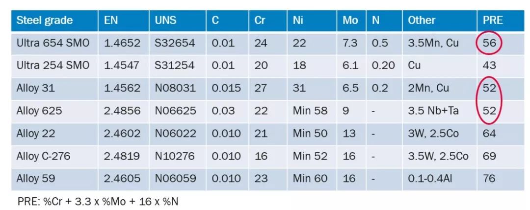 根據下表合金的抗點蝕當量-PRE值,Ultra 654SMO的耐腐蝕性能是要優于Alloy 31和Alloy 625。