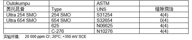 由于試驗環境是非??量痰模g電位高、試樣與橡膠環的縫隙非常緊密等,所以得出的具體耐縫隙腐蝕臨界溫度比在其它環境中所測的要低一些。但材料排比的經過是很清楚的: Ultra654 SMO AlloyC-276的耐腐蝕性最高、基本在同一水平上;6鉬的超級奧氏體不銹鋼和Alloy 625的耐腐蝕性則相對低一個檔次。
