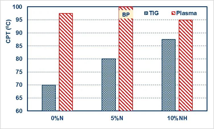 3   焊接方法和氣體對焊縫金屬的點腐蝕臨界溫度 (CPT, ) 的影響