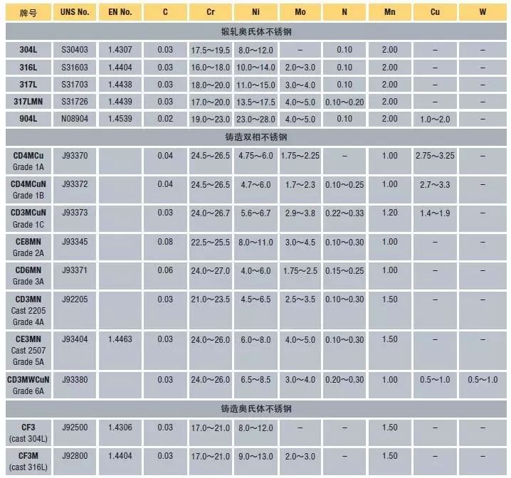 表1 鍛軋和鑄造雙相不銹鋼的化學成分*(重量%)