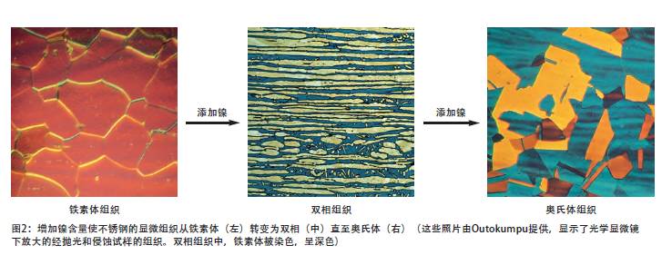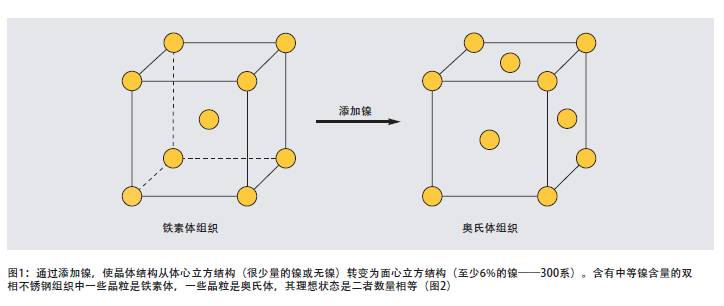 鎳是穩定奧氏體的元素,鎳促使不銹鋼的晶體結構從體心立方結構(鐵素體)轉化為面心立方結構(奧氏體)。鐵素體不銹鋼含極少的鎳或不含鎳,雙相不銹鋼含鎳量為低至中等,如1.5%~7%,300系奧氏體不銹鋼至少含有6%的鎳(見圖1、2)。添加鎳延緩了奧氏體不銹鋼中有害金屬間相的形成,但是在雙相不銹鋼中鎳的延緩作用遠不如氮有效。面心立方結構使得奧氏體不銹鋼具有極佳的韌性。雙相不銹鋼中有近一半是奧氏體組織,因此雙相鋼的韌性比鐵素體不銹鋼顯著提高。