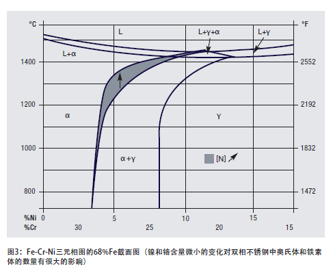 Fe-Cr-Ni合金三元相圖是雙相不銹鋼冶金行為的指路圖。從鐵含量為68%處的三元截面圖(圖3)可看出:這些合金以鐵素體(a)凝固,當溫度下降至1000℃(1832℉)左右時,部分鐵素體轉變成奧氏體(g)(取決于合金成分)。在更低溫度下,處于平衡態的鐵素體和奧氏體幾乎沒有進一步的改變。從圖3還可看出增加氮的影響。從熱力學觀點看,因奧氏體是由鐵素體轉變而來的,合金不可能跳過奧氏體的平衡態。然而,當繼續冷卻至較低溫度時,碳化物、氮化物、σ相以及其他金屬間相都可能成為顯微組織的成分。