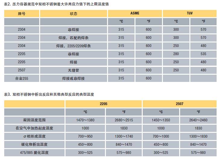 壓力容器設計規范中規定的各種雙相不銹鋼的溫度限值見表2。