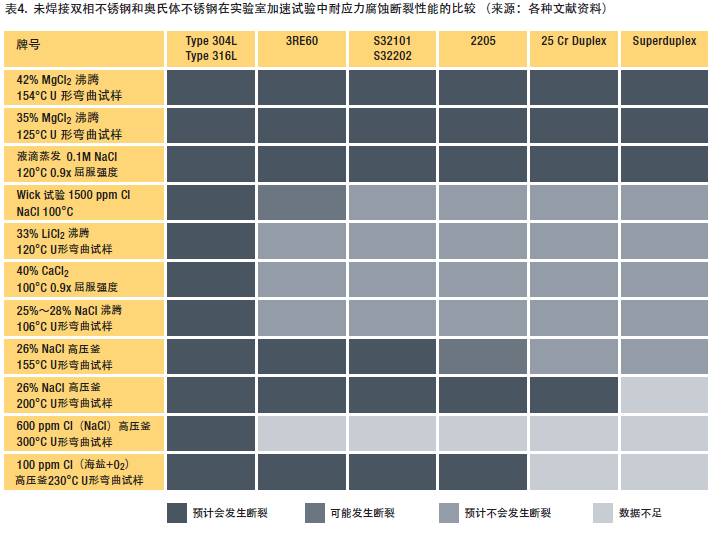 表4總結(jié)了在不同腐蝕程度的各類試驗介質(zhì)中,幾種不銹鋼的氯化物應力腐蝕斷裂行為。表左右兩側(cè)介質(zhì)分別由于含有酸性鹽和溫度高而條件苛刻。表中間的介質(zhì)條件不那么苛刻。鉬含量小于4%的標準奧氏體不銹鋼在所有這些條件下均發(fā)生氯化物應力腐蝕斷裂,而雙相不銹鋼能夠耐受上述中間范圍的中等試驗條件。