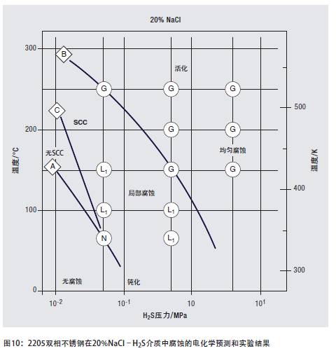 耐氫致應力腐蝕受多種因素影響,不僅與鐵素體含量有關(guān),而且與強度、溫度、充氫條件、外加應力等有關(guān)。雙相不銹鋼盡管對氫致斷裂敏感,但只要仔細評估和控制操作條件,在含氫介質(zhì)中仍可以利用其強度優(yōu)勢。這些應用中最突出的是輸送鹽水和高硫石油氣混合物的高強度管道。圖10說明了2205雙相不銹鋼在含氯化鈉的酸性介質(zhì)中對腐蝕免疫和敏感的范圍。
