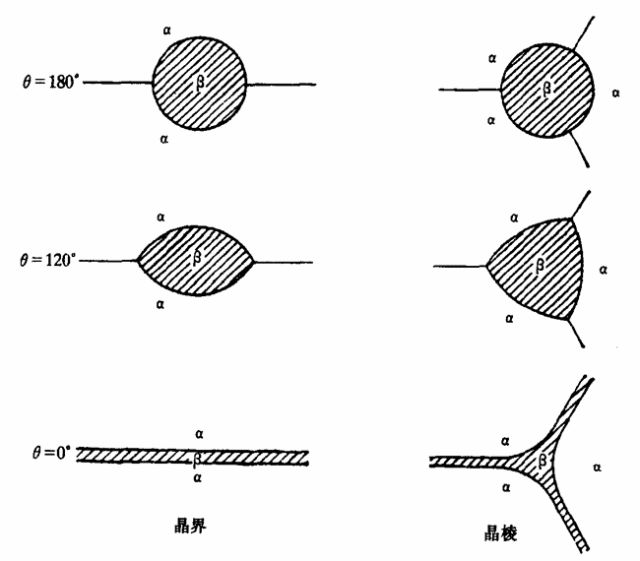 2.晶界第二相第二相(β)存在于基體(α)的晶界時(shí),第二相在兩基體晶粒間張開的角θ稱二面角。平衡條件下,有如下關(guān)系: