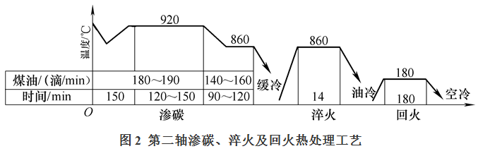 第二軸滲碳采用RQ3-9-9型井式氣體滲碳爐,淬火采用RYD-100-8A型插入式電極鹽浴爐,回火常用RJ2-75-6型井式回火爐。第二軸滲碳、淬火及回火熱處理工藝見圖2。