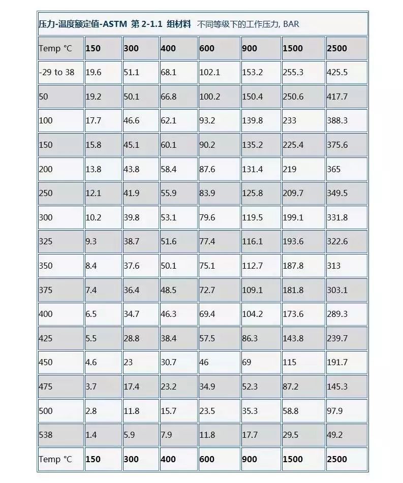 相應(yīng)于額定壓力的額定溫度是指法蘭和法蘭管件的承壓容器的殼體溫度。一般情況下,這個溫度與儲存流體的溫度相同。不按儲存流體溫度來選用壓力額定值的責(zé)任由用戶自負(fù)。當(dāng)溫度在-29℃(-20℉)以下時,額定值應(yīng)不大于-29℃(-20℉)時的額定值。
