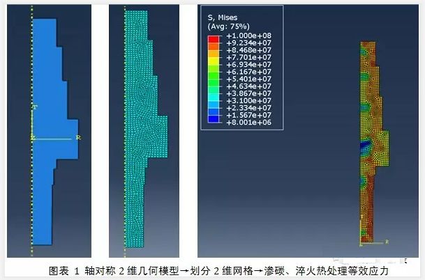 本案例首先對工件進行二維軸對稱模型的熱處理仿真分析,目的是排除非對稱因素,得到工件沿軸向及徑向的變形量,從而確定熱處理溫度場變化對齒輪軸徑縮、軸縮變形的影響程度;繼而對齒輪軸進行三維實體建模,并分析齒輪軸翹曲變形的影響因素及影響程度;最后,考慮淬火工藝中其它環境因素對變形的影響,并得出齒輪軸熱處理變形的影響成分。