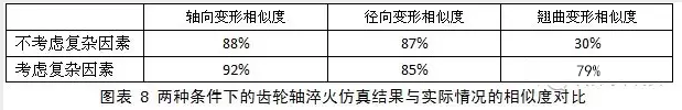下表進行了兩種條件下的齒輪軸淬火仿真結果與實際情況的相似度對比,復雜仿真條件下對齒輪軸翹曲變形的仿真準確性有顯著提高??梢?,根據上述變形機理與原因分析,已經建立了相對準確的工件熱處理變形模型,并可依次模型及對應的變形原因,在仿真環境下快捷、高效的以較低成本指導并設計相應的熱處理工藝優化方案。