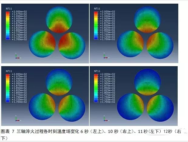 綜合考慮上述因素后,進行多軸淬火過程仿真,并以橫截面代替整根軸,觀察上述因素對圓截面上溫度場變化的影響如下圖。