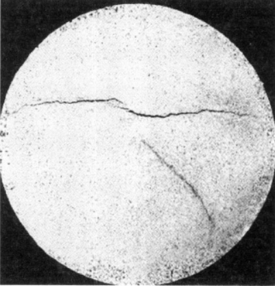 冷裂紋是在鑄錠冷卻到溫度較低的彈性狀態時,若錠坯內外還存在較大的溫差,則收縮應力可能集中于某些薄弱區域。一旦應力超過了金屬的強度和塑性極限,鑄錠將出現冷裂。冷裂紋的特征是多呈穿晶開裂,多呈直線擴展,裂紋較規則、挺拔平直。冷裂紋往往由熱裂紋發展而來。