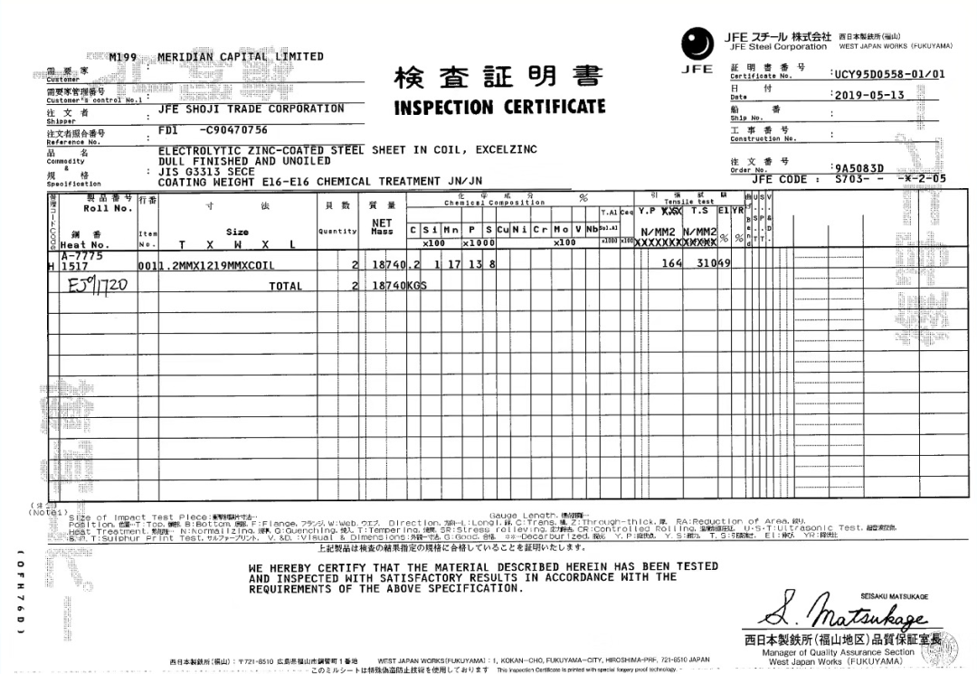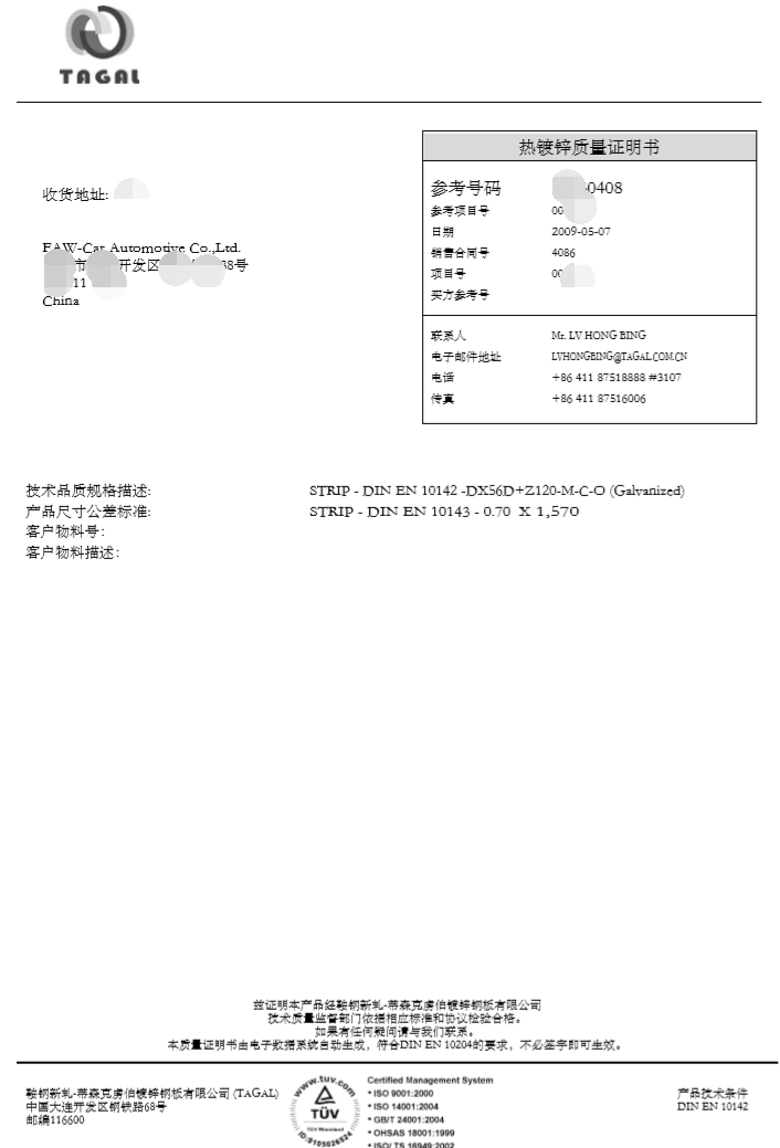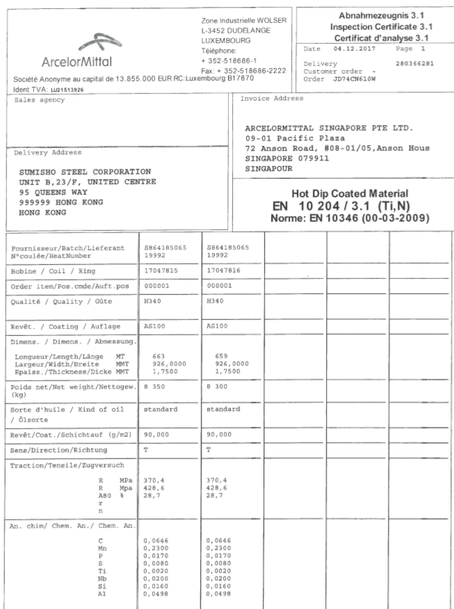 (該檢驗(yàn)文件)符合EN 10204 的3.1.B條款的要求。檢驗(yàn)文件(我們俗稱質(zhì)保書)不是隨便打印的,也有它的執(zhí)行要求。
