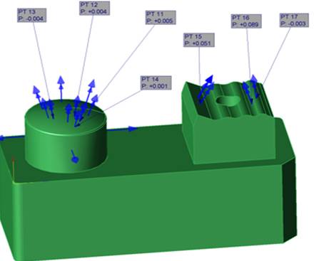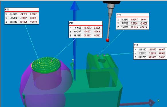 3D數模導入對比測量:加工完成的零件,為了確認與設計一致性或在裝配fit模過程中發現配合異常,當一些曲面輪廓既非圓弧,又非拋物線,而是一些不規則的曲面時,無法進行幾何元素測量時,可導入3D模型與零件對比測量,從而了解加工誤差;因測量值是點對點的偏差值,能便于進行快速而有效的修正改善(下圖所顯示的數據為實測值與理論值的偏差)。