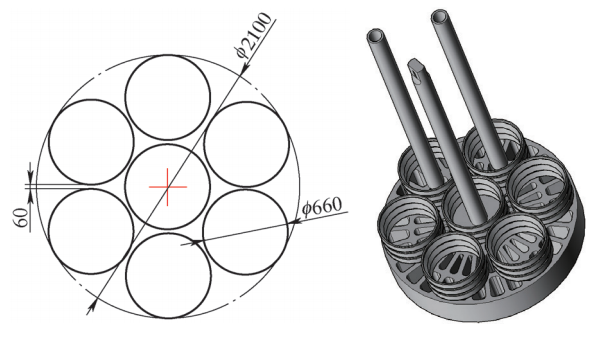 該軸承為雙列圓錐滾子軸承,每套軸承圈含2只軸承外圈和1只軸承內圈,客戶也按此比例來料加工。450kW井式熱處理爐導流筒最大尺寸φ2300mm×3500mm,實際裝料時直徑方向單邊預留100mm安全余量,高度方向預留100mm安全余量。按此規(guī)格實際裝料應控制在φ2100mm×3400mm圓柱體積內。每只軸承圈中軸承外圈直徑最大,按φ660mm估算一個平層內擺7只,可發(fā)揮最大爐容。為保證高層碼垛時的穩(wěn)定性,每串碼垛中心設一中心導向立柱,如圖2所示。