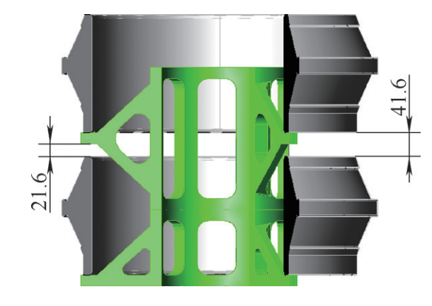 軸承內圈總高為213.4mm,考慮到熱處理加熱溫度下:①鋼鐵部件會有一定的膨脹量。②長期使用的情況下工裝會變形從而導致料盤碼垛傾斜。因此,碼垛層之間必需預留一定的變形空間,但該尺寸不宜大,否則影響碼垛層數(shù),綜合考慮后確定中心托架的總高控制在255mm,這樣2只軸承圈之間有41.6mm的間隙,軸承圈與托架支壁的最小間隙還有21.6mm(見圖3),從而保證了碼垛安全。