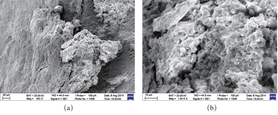 損傷表面能譜分析后發現,主要含有Fe及少量Cr、Mn元素,未見其他異常元素。螺紋表面銹蝕區域存在泥紋狀腐蝕產物,能譜分析除基體元素外含有較高的O、Cl元素,螺紋表面微觀形貌如圖5所示。