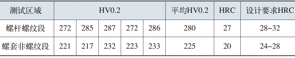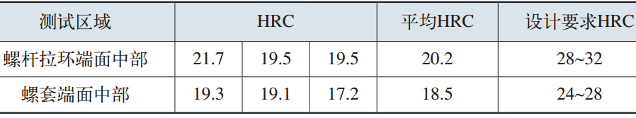 表面硬度不足,可能與回火溫度過高,造成馬氏體分解而降低硬度有關。對螺桿拉環、螺套端面的中部進行了維氏硬度測試,心部硬度明顯低于設計要求,測試結果見表2。