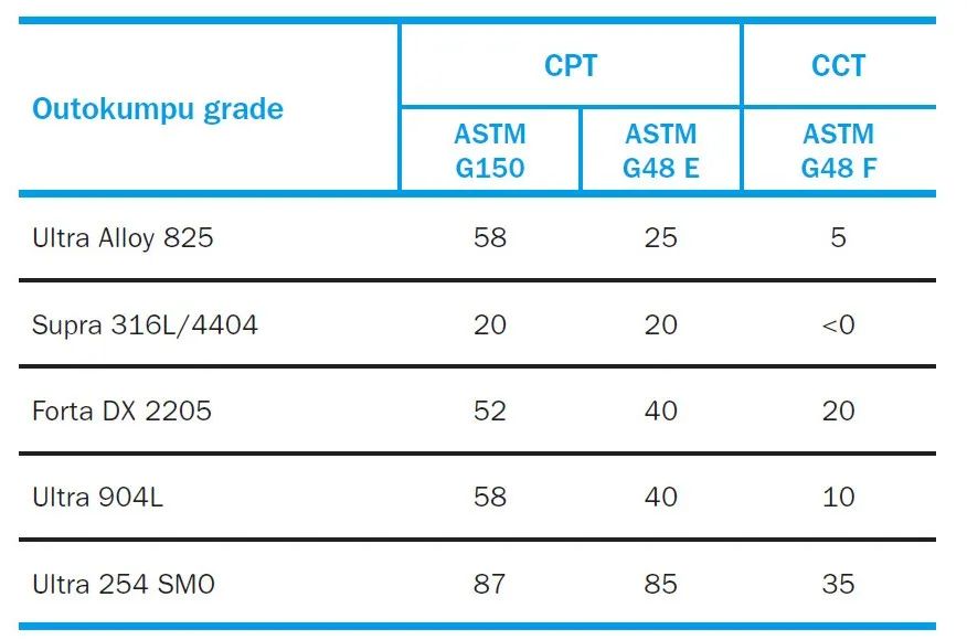 見右表2。盡管如此,在這些條件下要獲得較高的耐腐蝕性能,我們建議使用Ultra 254 SMO。這是一種特殊合金,廣泛用于長期暴露于海水,煙道氣和漂白劑的環(huán)境中,例如船用脫硫,紙漿和造紙行業(yè)等。