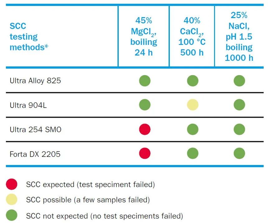 Ultra Alloy 825在氯化物侵蝕和堿性的環(huán)境中具有很高的抗應(yīng)力腐蝕開裂(SCC)的能力。通過在非常苛刻環(huán)境的ASTM G36測(cè)試,暴露在含45%的氯化鎂(MgCl2)沸騰溶液中24小時(shí)以上不會(huì)發(fā)生應(yīng)力腐蝕開裂(見右表3)。