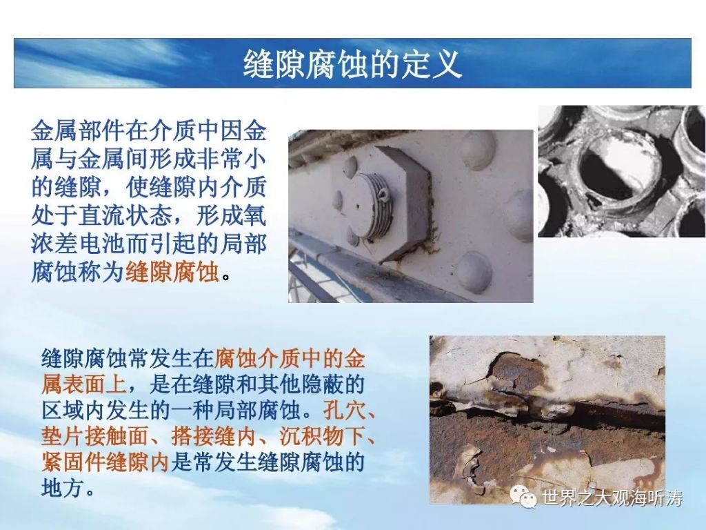 縫隙腐蝕,許多金屬構件是由螺釘、鉚、焊等方式連接的,在這些連接件或焊接接頭缺陷處可能出現狹窄的縫隙,其縫寬(一般在0.025~0.1mm)足以使電解質溶液進入,使縫內金屬與縫外金屬構成短路原電池,并且在縫內發生強烈的腐蝕的局部腐蝕。
