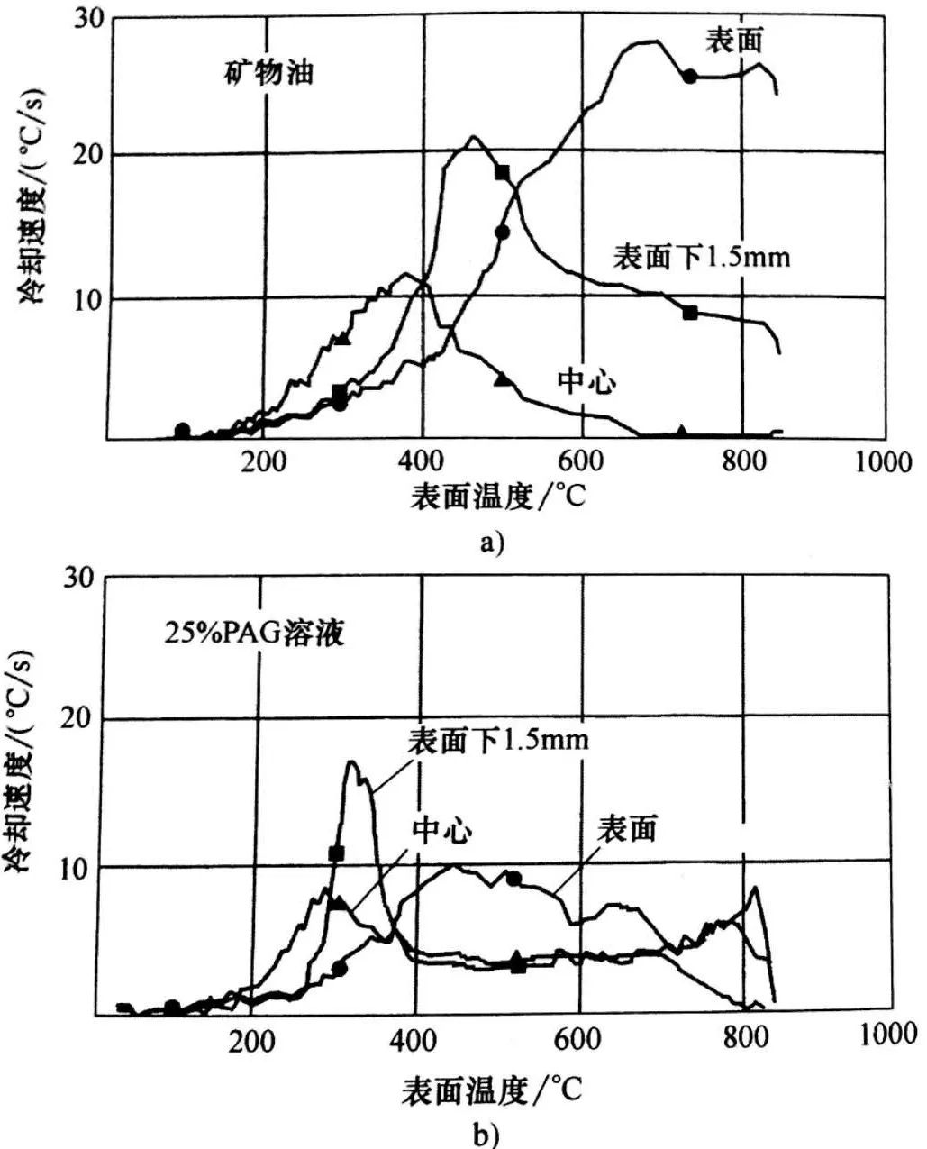 探頭的三個熱電偶的冷卻速度隨表面溫度變化的曲線如圖2 所示,圖2 a)為在礦物油中冷卻,圖2 b)為在25%的 PAG 溶液中冷卻。注意:PAG 溶液淬火的最大冷卻速度出現在探頭表面以下1. 5mm處。觀察在表面下1. 5mm處用熱電偶測得的PAG溶液的冷卻曲線,見圖2 a),該曲線在570℃處的斜率有明顯改變,反映了冷卻速度的不連續改變。