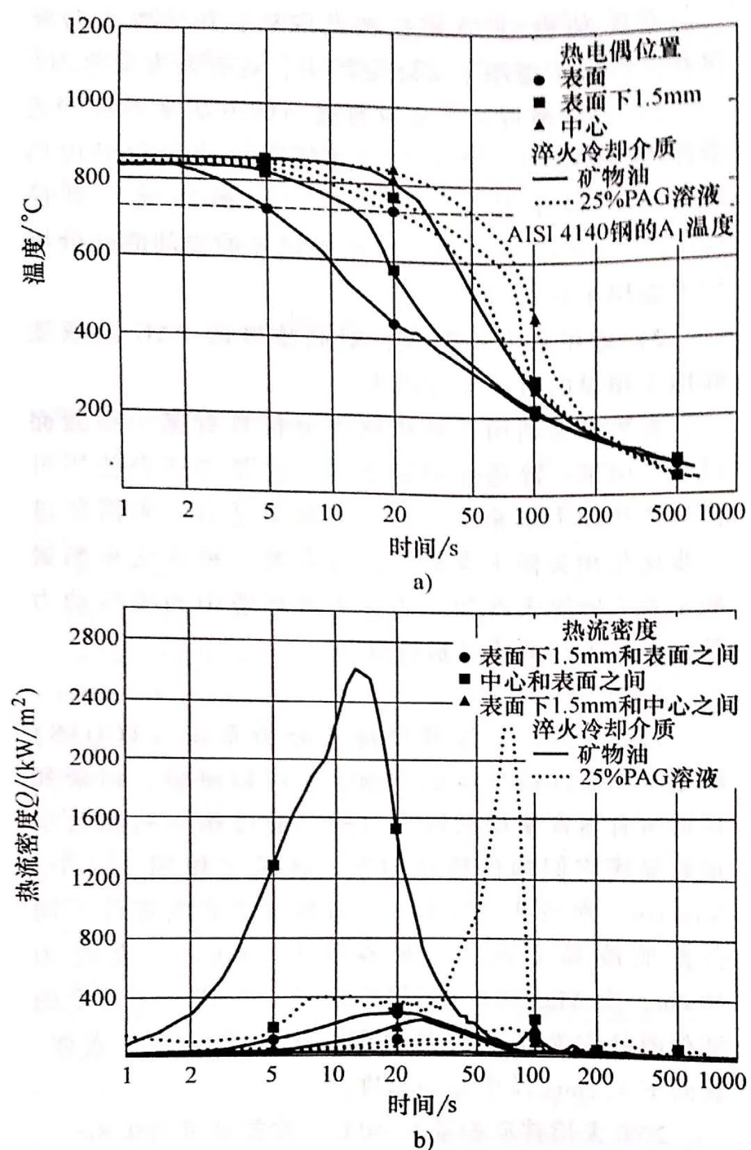由于熱流密度是對真實傳熱的測量,兩種淬火冷卻介質“表面下1. 5mm和表面”的曲線,圖1 b)的對比就顯得令人關注。對于油淬,Q從200kW/m2 增加到其最大值 2600kWm2只需要 12.5s,而Q降回200kW/m2 需要35s。對于聚合物溶液淬火,Q從200kW/m2 增加到其最大值2250kW/m2 所需時間增加至67s~5.4min, 但Q降回200kW/m2僅需23s~1.5min。