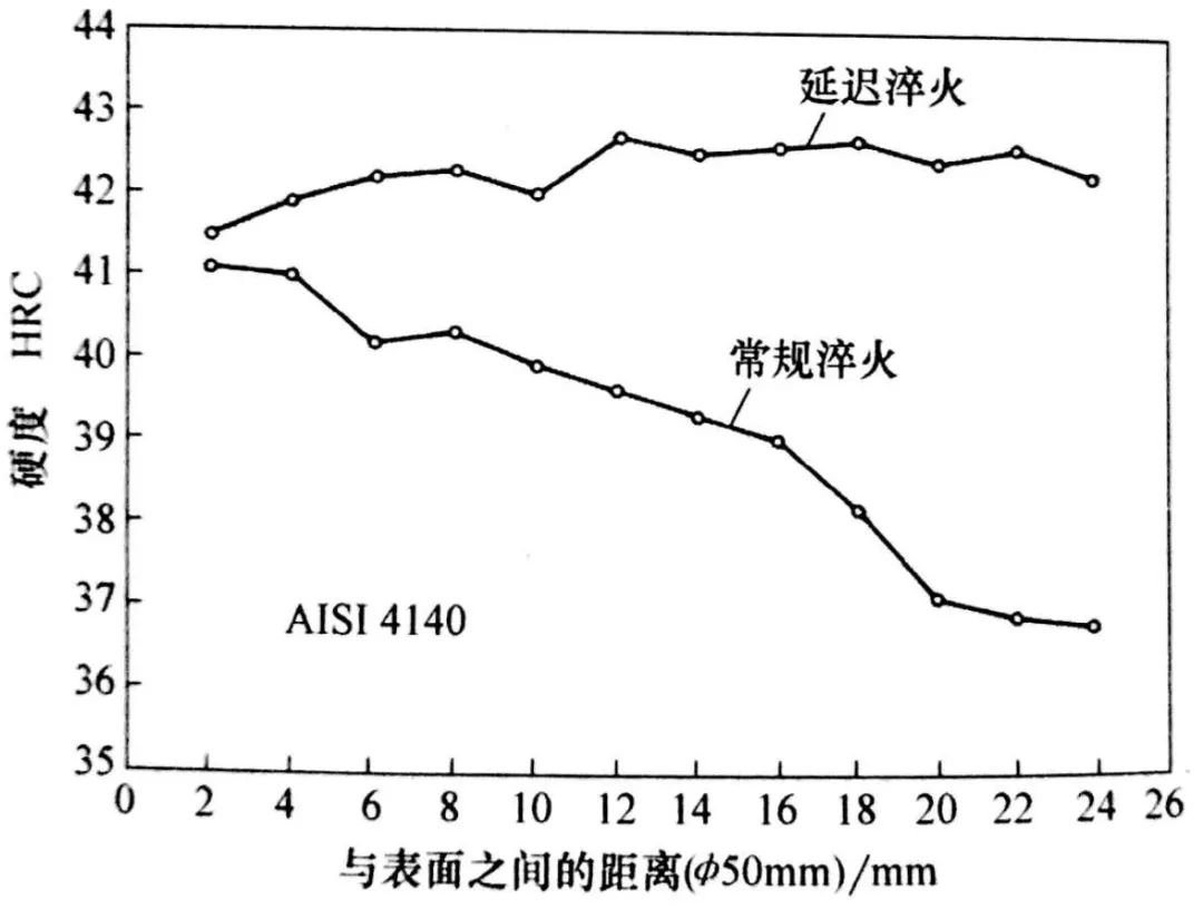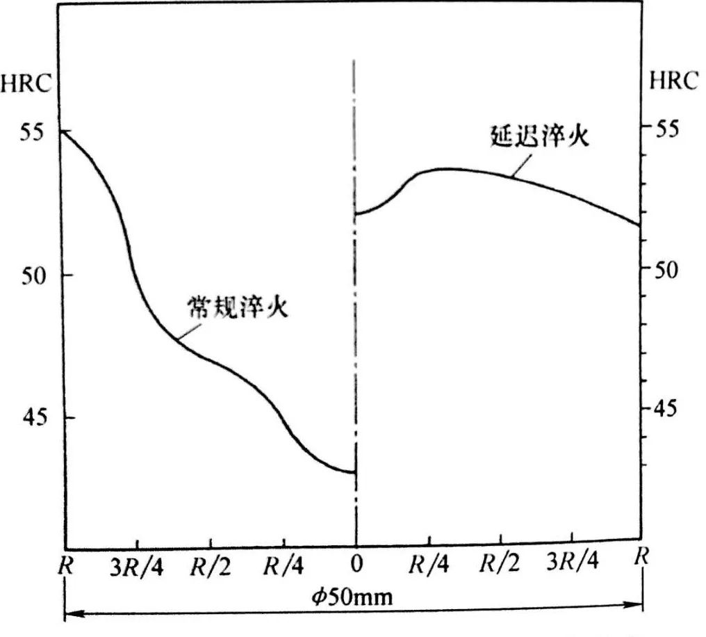 3)預冷淬火亦即逆淬火對硬度分布的影響取決于鋼的淬透性和橫截面尺寸。