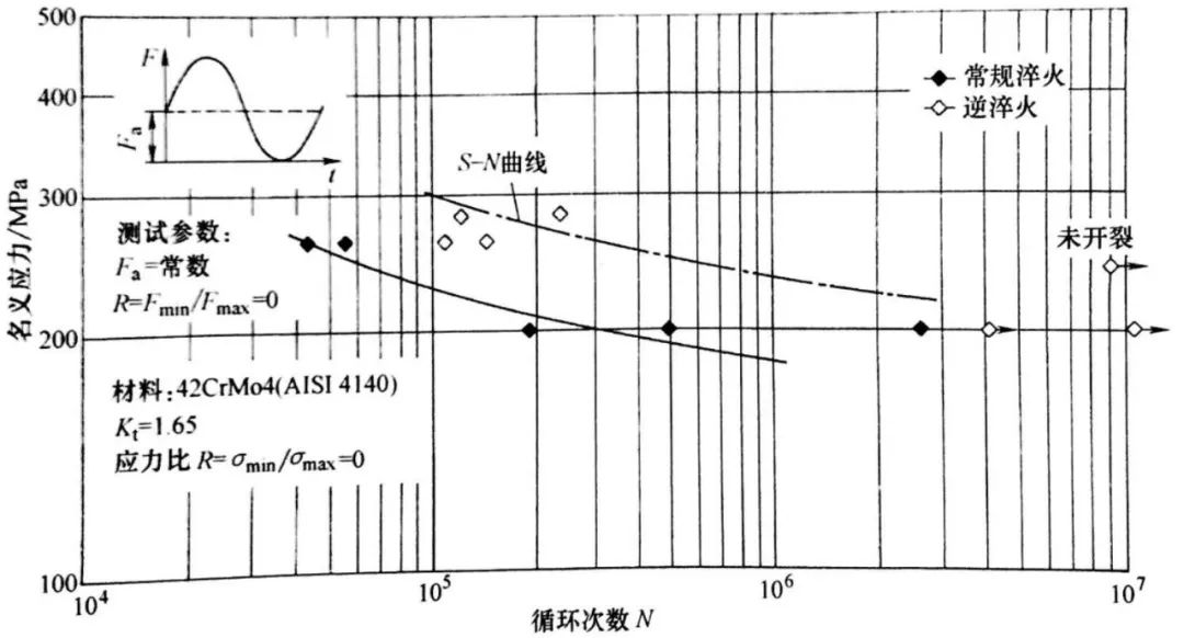 用統一路號的 Φ50mm×300mm 4140 鋼試樣做彎曲疲勞測試。試樣在保護氣氛中 860℃ 奧氏體化,然后分別做常規淬火和逆淬火。