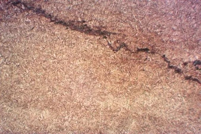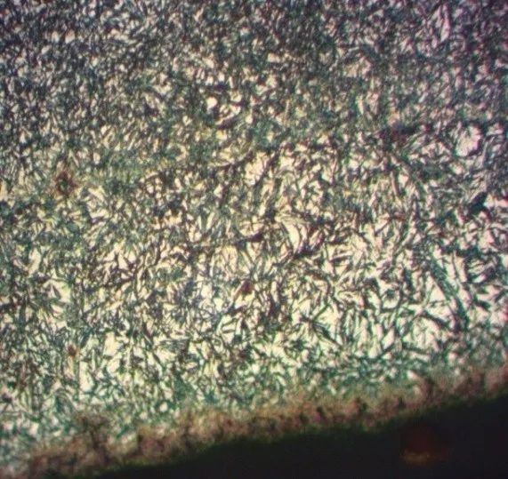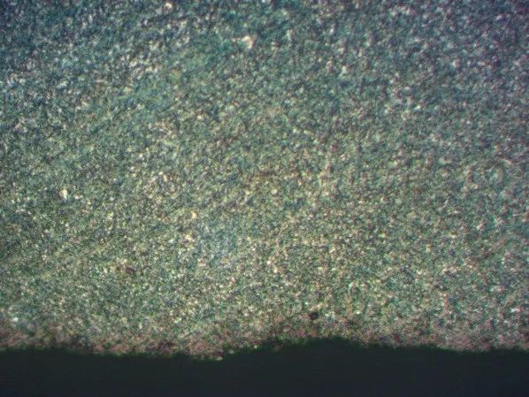 由以上金相圖片可以看出,該零件回火穩(wěn)定性非常高,需要2~3次回火才能將殘留奧氏體量控制到較低的水平。熱處理工藝從滲碳后直接淬火改為“滲碳后緩冷,然后再加熱淬火”,并200℃保溫4H三次回火后,金相組織較好,工藝改進(jìn)取得較好效果,但意外的是試制的第一爐產(chǎn)品(二次回火)在磨削后放置3天后又發(fā)現(xiàn)1件裂紋,裂紋部位、形狀與前面發(fā)現(xiàn)的相同,經(jīng)對(duì)裂紋件取樣分析,金相組織為C3,A+M4級(jí),為此我們?cè)俅螌?duì)工藝進(jìn)行了改進(jìn)。