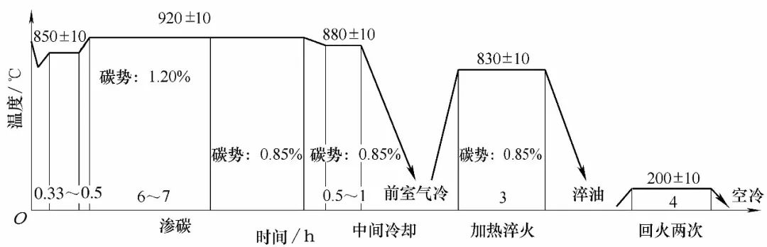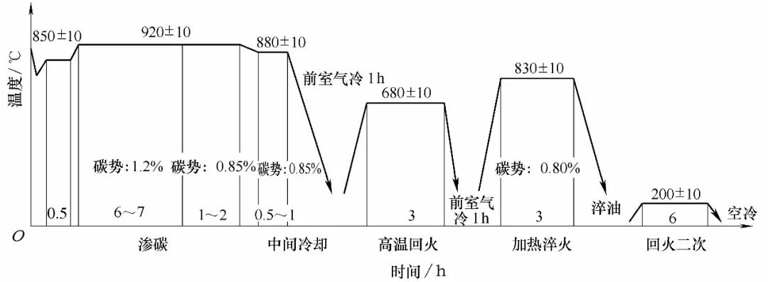為盡可能地減少殘留奧氏體量,決定采取“滲碳+高溫回火+加熱淬火+兩次回火“的工藝方案,滲碳后高溫回火的目的是為了使?jié)B碳層中的高碳高合金度的馬氏體和殘留奧氏體發(fā)生分解,析出合金碳化物,并發(fā)生向特殊碳化物轉(zhuǎn)化,這些特殊碳化物在隨后的淬火加熱過程中由于加熱時(shí)間較短,不能再充分完全地溶入奧氏體,因而降低了奧氏體中碳和合金元素的含量,使Ms點(diǎn)升高,以減少淬火后殘留奧氏體量。其工藝曲線如圖10所示。