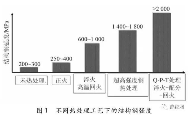 熱處理可以大幅度提高金屬材料的強度。例如結構鋼,工業上很多都是用調質鋼(淬火以后高溫回火),它的強度約為600~1000MPa。二戰期間曾經有過一個很大的飛躍,前蘇聯把飛機起落架由調質處理變成淬火以后低溫回火,使它的抗拉強度提高到1600MPa,前蘇聯戰機安裝新的起落架以后,自重減輕,靈活性提高,在技術上領先了德國空軍,從此有超高強度鋼的熱處理誕生。隨后經過持續研究,結構鋼的強度達到1800MPa。近年來,徐祖耀院士帶領他的團隊研究Q-P-T處理(淬火配分回火再強化),使得結構鋼強度提高到2100MPa,比原來調質處理后的強度提高了三倍。最新消息,北京鋼研院正在研究2600MPa鋼種,強度的提高不僅決定于鋼的成分,而且決定于熱處理工藝,從此可以看出熱處理的關鍵作用。
