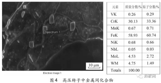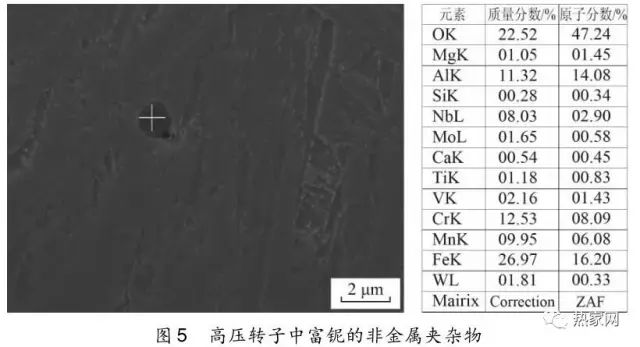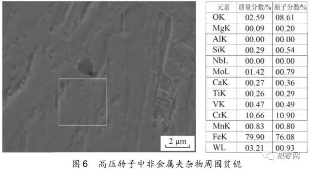 熱處理研發難度大,掌握熱處理就是掌握市場競爭力的核心要素。例如高壓轉子,我們團隊研究了幾年,熱處理后會出現不同的情況,有一個轉子很奇怪,只有一個位置強度特別低,其他位置都很好,低的地方,經過分析,原來是局部鍛造加熱過燒(見圖3)。還有時候,熱處理后的組織中出現金屬間化合物(見圖4),因為這種轉子材料之所以能用到600℃,是靠加合金元素,但是有時候合金跑到金屬間化合物中,只有經過正確的熱處理把金屬間化合物消除,固溶體才能發揮耐熱性,使合金元素溶入。有時上一輪按照這個工藝做,性能好好的,現在一輪不行了,經過我們長時間分析,偶然發現有個黑點,這個黑點是非金屬夾雜,從這里打探針,發現它的鈮含量特別高(見圖5),附近則貧鈮(見圖6),邊上一大圈熱強度降低,在620℃拉伸的時候,出現一個個空洞。同時我們也注意到,空洞的數量和斷裂時間呈反比(見圖7)。所以說也只有控制了氧含量和非金屬夾雜物,并且進行正確的熱處理,才能得到合格的產品。