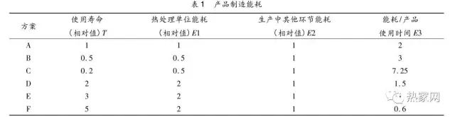 表中的方案A,熱處理能耗是1,如果熱處理之外的能耗也是1,總制造能耗為2;如果熱處理能耗降低50%,但是壽命同時也降低50%,即方案B,則總制造能耗反而增加了1.5倍。如果熱處理能耗降低50%,使用時間只有原來20%(完全可能),即方案C,那么總制造能耗增加約4倍。反過來如果改進熱處理工藝,熱處理工藝本身能耗提高1倍,同時壽命可以提高1倍,即方案D,則總制造能耗反而減少25%;如果改進熱處理工藝后壽命提高5倍即方案F,則總制造能耗減少70%;節能效果非常明顯。所以說要辯證地看待熱處理能耗和社會總能耗,正是這個認識上的誤區,導致我們在制定政策上有很大的失誤。