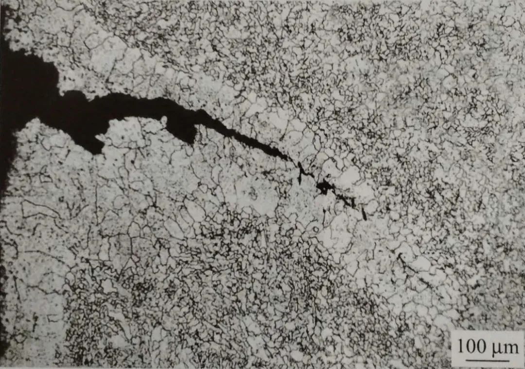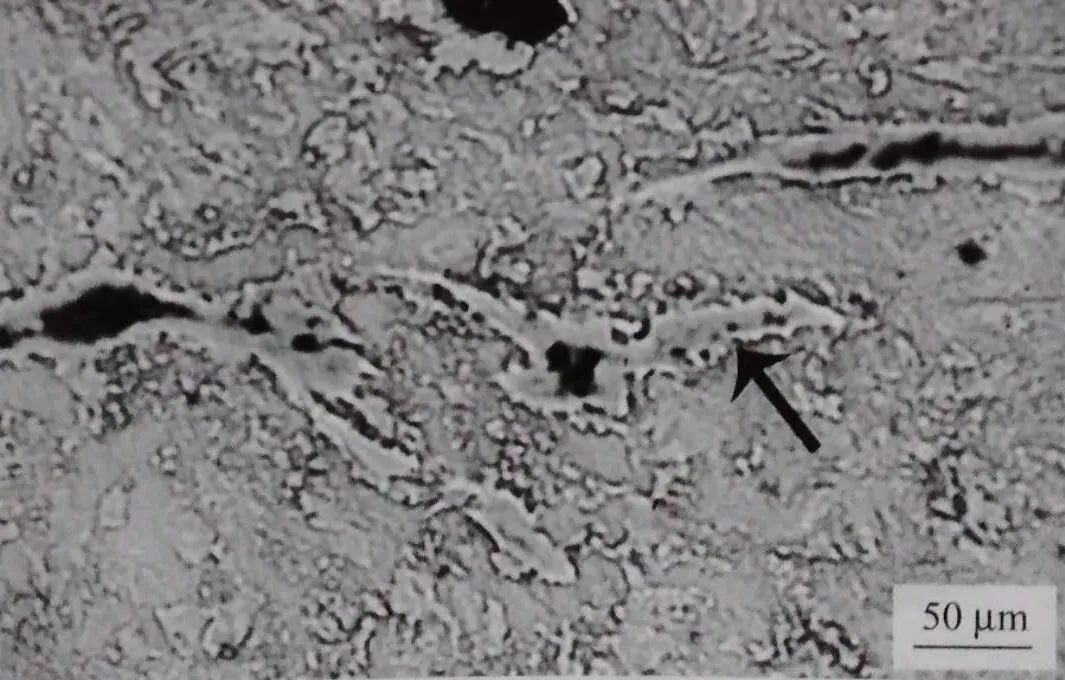 試樣用3%硝酸酒精溶液浸蝕后,正常部位組織為珠光體和網狀鐵素體。與之相比,裂紋區域珠光體量多且組織粗大,裂紋和孔隙多沿原奧氏體晶界分布,見圖1-29, 根據組織特征判斷,裂紋區域碳含量偏高(接近0.7%) 。