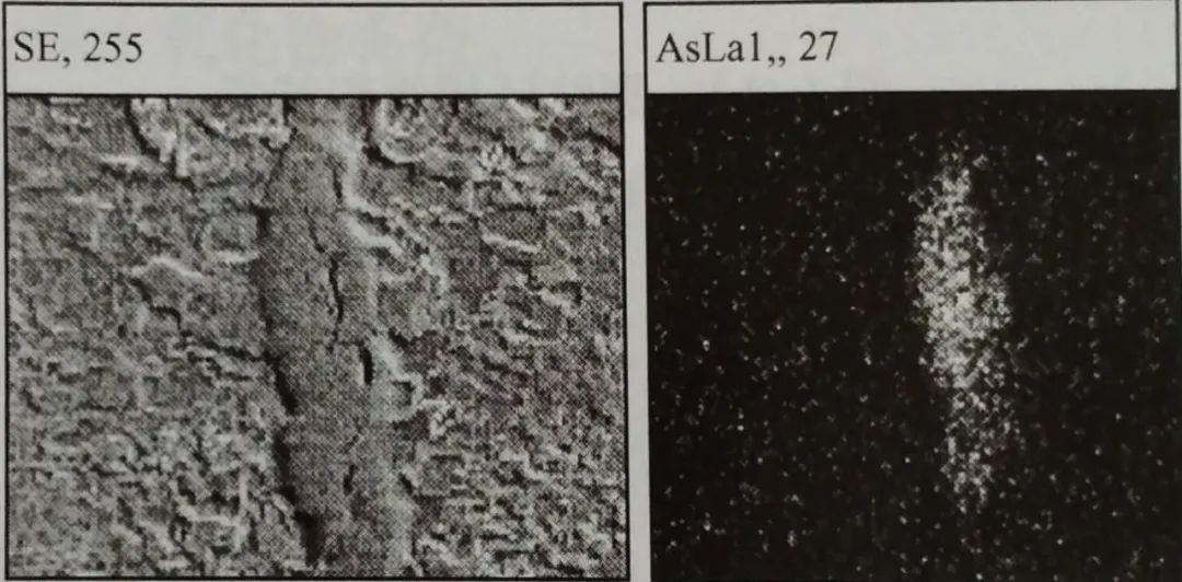 用電子探針分析儀對金相試樣上的灰白色浮凸相進行微區成分分析,浮凸相w (As) 高達7.22%。砷元素分布形態見圖1-11、圖1-12。而鋼板正常部位w (As) =0.028%, 與正常部位相比,裂紋附近的砷明顯富集。