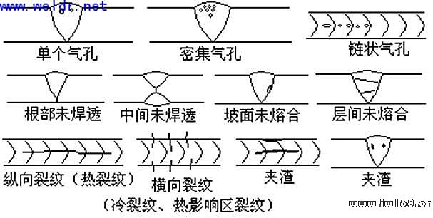 以上的外部缺陷多容易使焊件承載后產生應力集中點,或者減小了焊縫的有效截面積而使得焊縫強度降低,因此在焊接工藝上一般都有明確的規定,并且常常采用目視檢查即可發現這些外部缺陷。