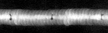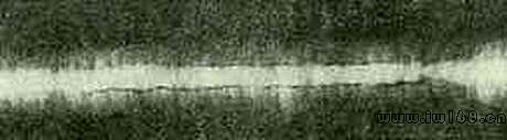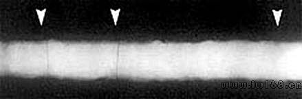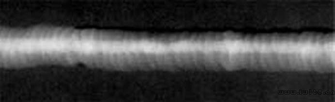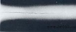 厚度14mm低合金鋼板對接焊縫X射線照相底片,X型坡口,自動焊,縱向裂縫(照片來源:《焊縫射線照相典型缺陷圖譜》崔秀一 張澤豐 李偉 編著)