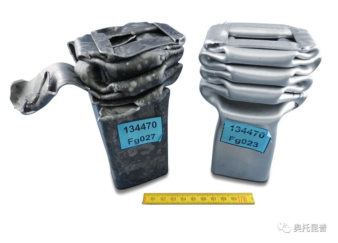 圖4.在以高于30 km / h的速度進行的碰撞測試中,Forta H1000(右側)可以吸收沖擊能量而不會失效。該測試將Forta H系列與左側的熱成型鋼型材(22MnB5)進行了比較,該型材無法承受沖擊并發生脆性破壞