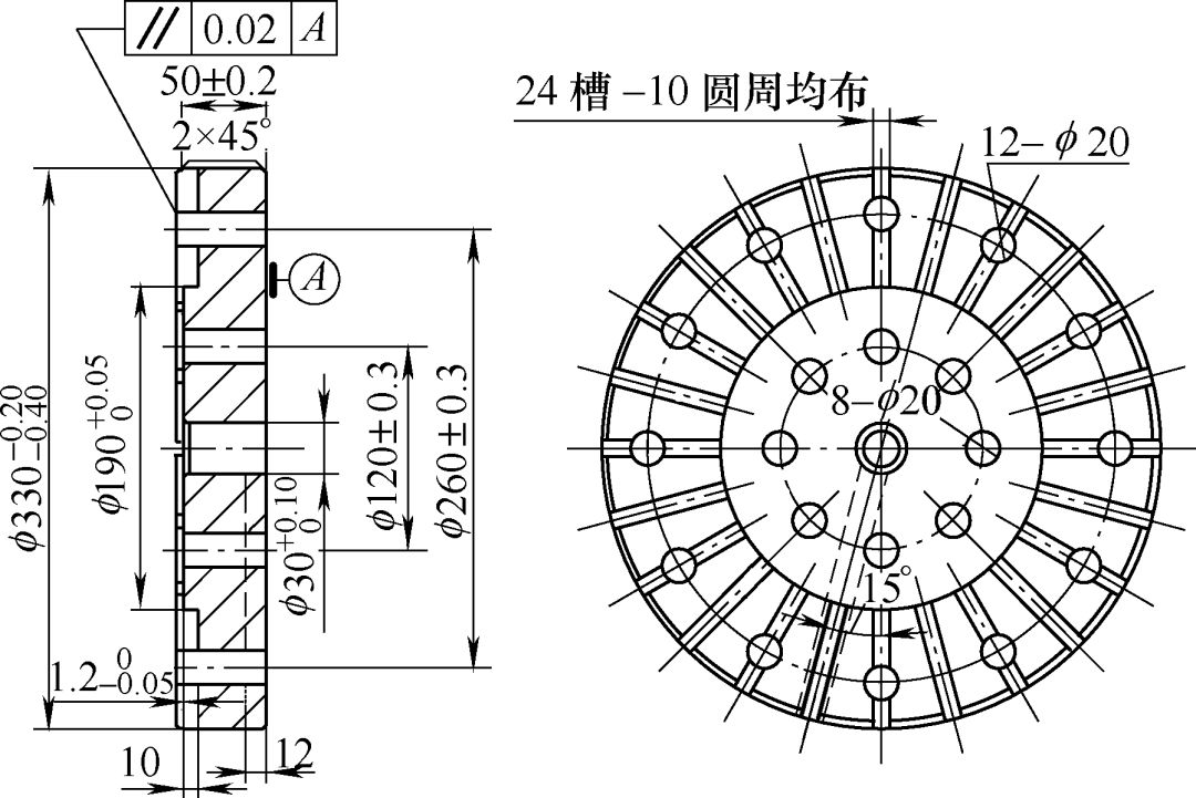 如上圖所示,零件在淬火過(guò)程中,是將零件平放于淬火底模上,淬火底模的平面在加工過(guò)程當(dāng)中,將盤(pán)面加工出24個(gè)凹槽,這樣的設(shè)計(jì)有利于零件在淬火過(guò)程中,利于淬火油的循環(huán)流動(dòng),增強(qiáng)淬火油的冷卻性能,提高了淬火油的冷卻能力,同時(shí)也可以保證零件表面硬度能夠達(dá)到技術(shù)要求。