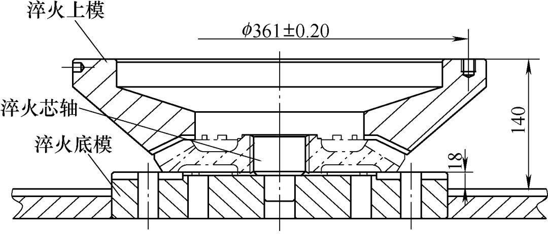 由于淬火上模和淬火底模都加工出了凹槽,這樣在零件的淬火冷卻過(guò)程中,能夠調(diào)整了淬火油量的熱平衡流量,保證淬火時(shí)油量充足,零件能夠得到良好的淬火效果。