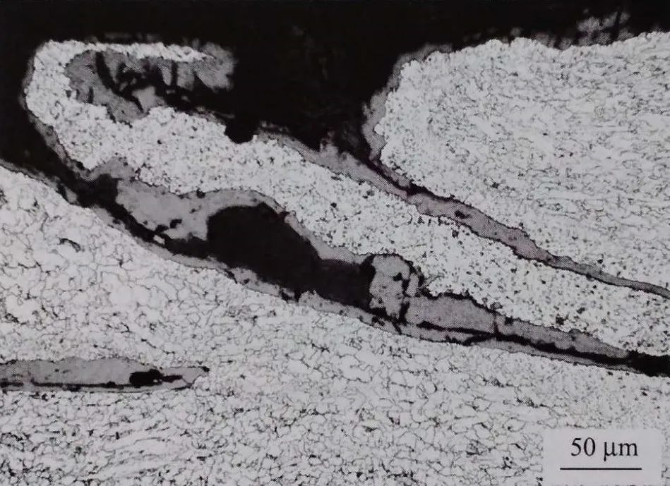 從以上結果可以看出,帶有缺陷的鑄坯經高溫加熱和軋制后,由于沿缺陷縫隙內氧化的結果。在缺陷處形成由氧化鐵和密集分布的氧化圓點組成的氧化層,該氧化層在鋼基中似一夾層,在軋制時不能被軋合,遺留在鋼板表面便成為裂紋缺陷。