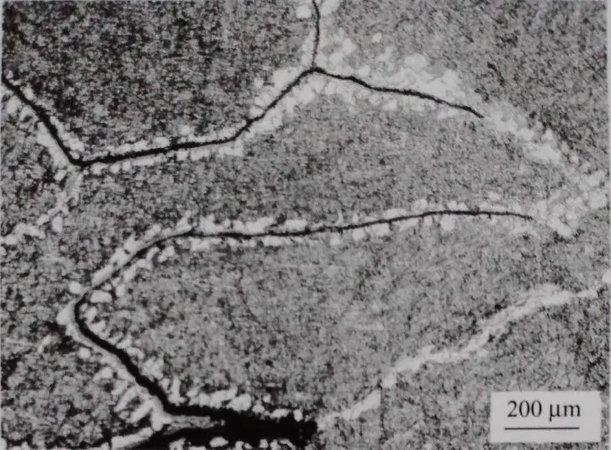 0.7mm, 附近無高溫氧化特征。經試劑浸蝕后,裂紋兩側的組織及晶粒表現出明顯不同的兩個部分,見圖1-71, 圖中裂紋上側鐵素體晶粒明顯粗大,下側晶粒十分細小且組織具有顯的方向性。