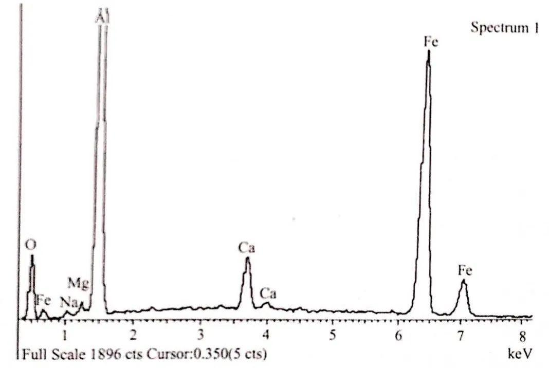 沿板厚方向取截面試樣磨制后進行顯微觀察,疤皮根部有夾縫,夾縫附近有聚集分布的粒狀夾雜物,見圖1-60。掃描電鏡能譜分析結果表明,夾雜物為鋁酸鈣,見圖1-61。圖1-60 截面夾縫附近及延伸處聚集分布的顆粒狀夾雜物