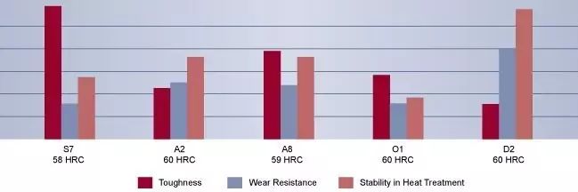 注:Toughness=韌性,Wear Resistance=耐磨性,Stability in Heat Treatment=熱處理穩定性。