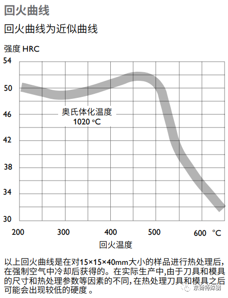 根據(jù)所需硬度,參照以下回火曲線圖來選擇相應(yīng)的回火溫度。回火至少進(jìn)行兩次,兩次回火之間必須冷卻至室溫。最低回火溫度不能低于250oC。回火保溫時(shí)間至少為2小時(shí)。